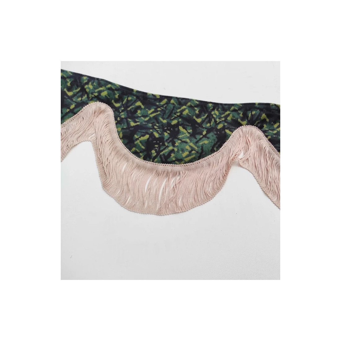 Faldón para parabrisas (exterior e interior de tejido de felpa VERDE de estilo danés DP03, flecos BEIGE) con montaje con velcro.