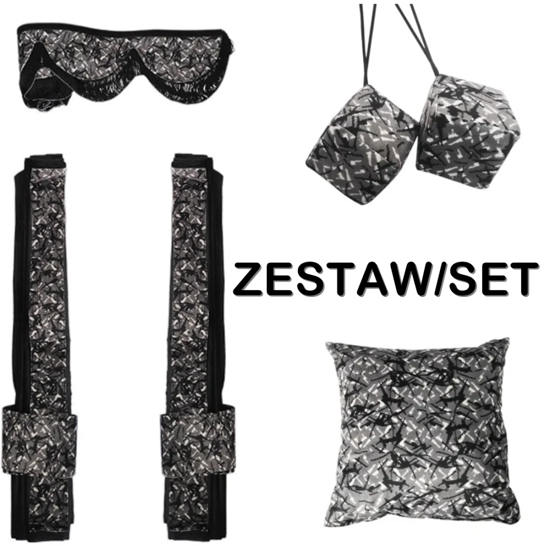 CONJUNTO DANÉS: CORTINAS DE FELPA GRIS + ROLLOS + ALMOHADA + DADOS